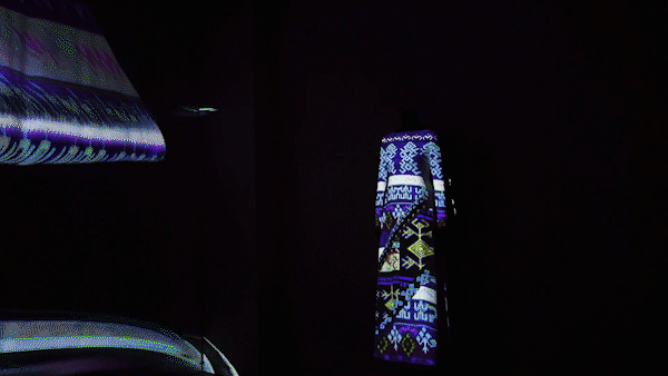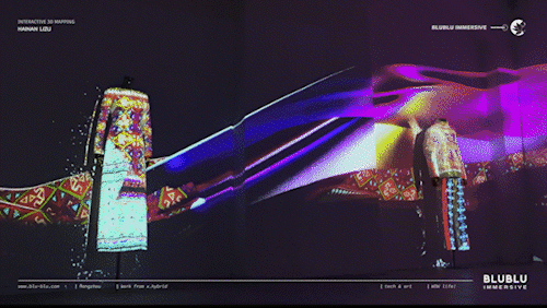 利用3D投影技术,通过激光投影设备及软件算法,将多个投影画面和两个立体人台及服饰融合成一体,让黎锦纹样拥有动态的三维演绎。如观众想深入参与黎锦的创作,也可通过实时交互系统,利用现场触控屏进行纹样选取与制作,创作属于自己的独特黎锦服饰,结果将直接呈现在投影画面上。让黎锦文化通过全新的互动体验与世界对话。